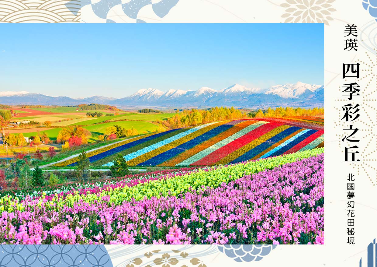 【美瑛四季彩之丘】北海道的農產之鄉,馬鈴薯、小麥等作物為主要產出。作物農田起伏如波浪般展向遠方,色彩紛呈,直造物主在拼補花布般;初夏鈴蘭開花時,美得彷彿身處幻夢之中。廣達7公頃的夢幻花海,遍植薰衣草、大波斯菊與向日葵等數十種觀賞花卉【花期5月中旬~10月下旬】;位於美瑛町的全景地帶,能眺望旭山和十勝山連峰的自然景觀,花海繽紛的壯麗與遠山層疊縈雲的壯美,相映成趣。四季彩之丘與富田農場一樣為私人觀光花園,主人悉心照料下使搭上花畑遊園車的貴客彷若身入畫中,置身造物主擺設的巧思裡,讓緩緩映入眼簾的幸福感隨觀景角度。