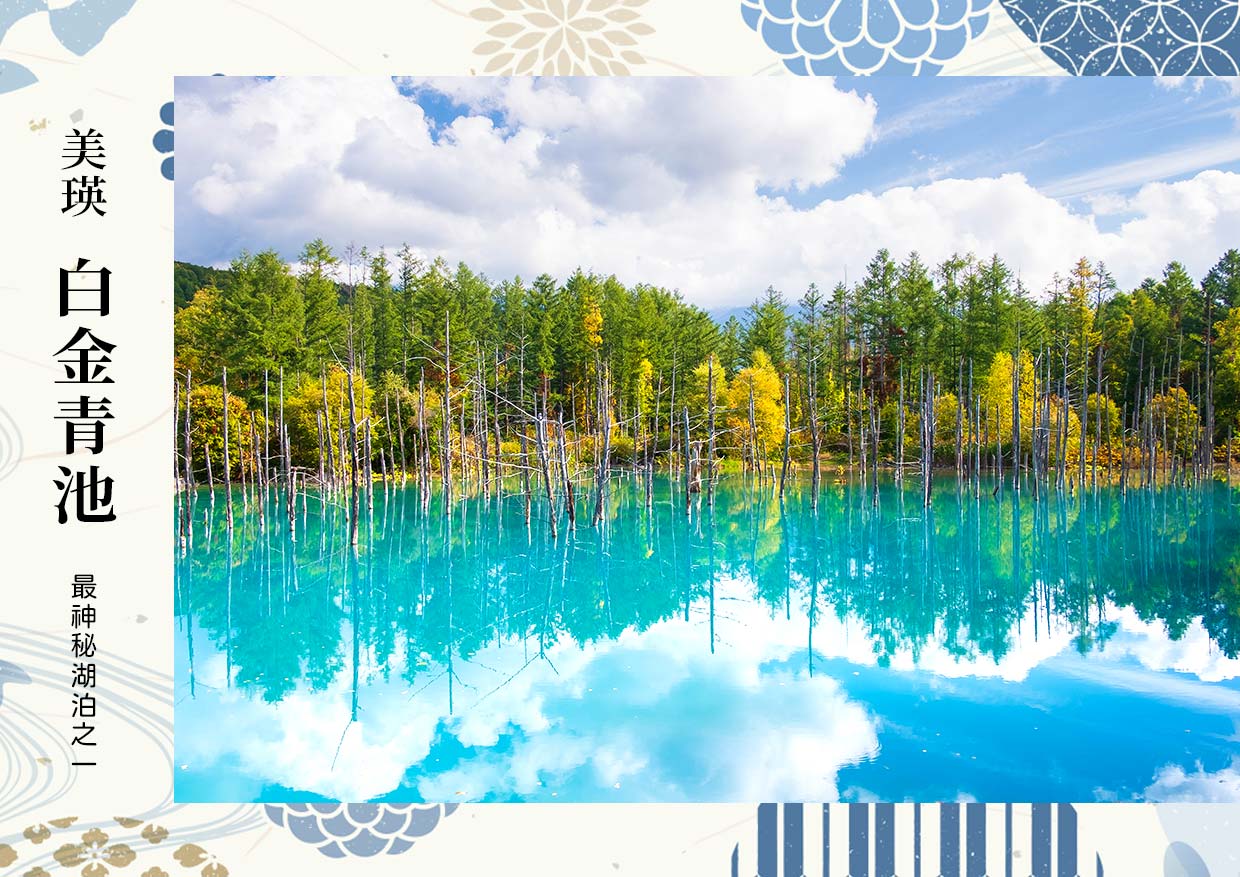 【白金青池】充滿神秘氣氛的藍色自然奇景,位在北海道美瑛的自然奇景「青池」,由於含有氫氧化鋁成分的瀑布流入美瑛川產生的特殊的膠質後,形成粉藍的湖水色。豎立在湖上的日本落葉松枯木和湖水相襯交織成神秘氛圍,是許多專業攝影師前往拍攝的著名美景。因水中鋁成分含量較高,在陽光照射下映成了耀眼的藍色,故被稱為青池,雲霧繚繞時有如身在仙境。