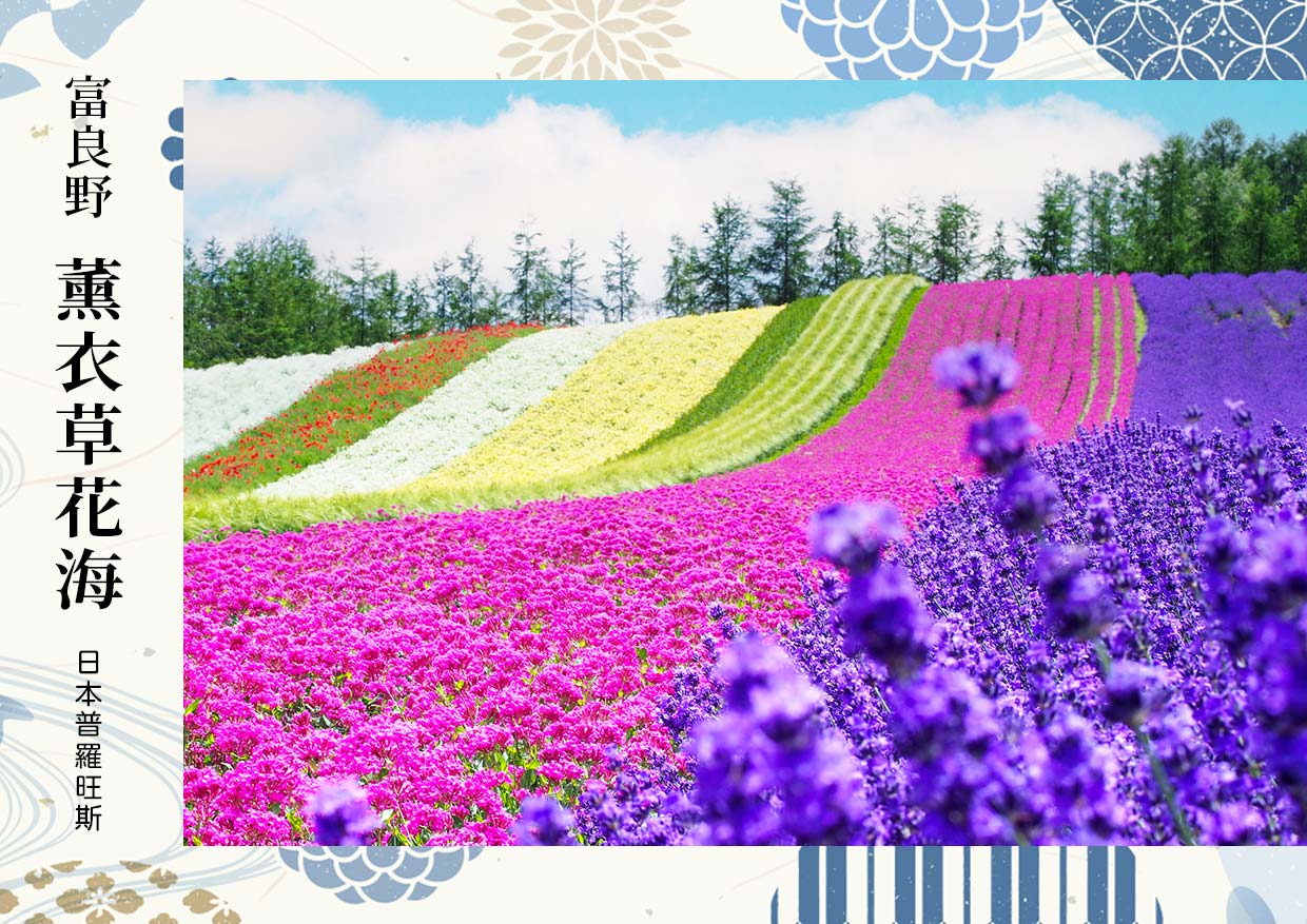 暢遊紫色薰衣草花田:在浪漫的氣氛中感受薰衣草的夢幻美麗。整個富良野遍植著嬌豔欲 滴的紫色薰衣草,廣大的丘陵到了此時就像一張超大的紫色地毯,讓人忍不住想上去躺一躺並且有許多日本廣告都在此拍攝。