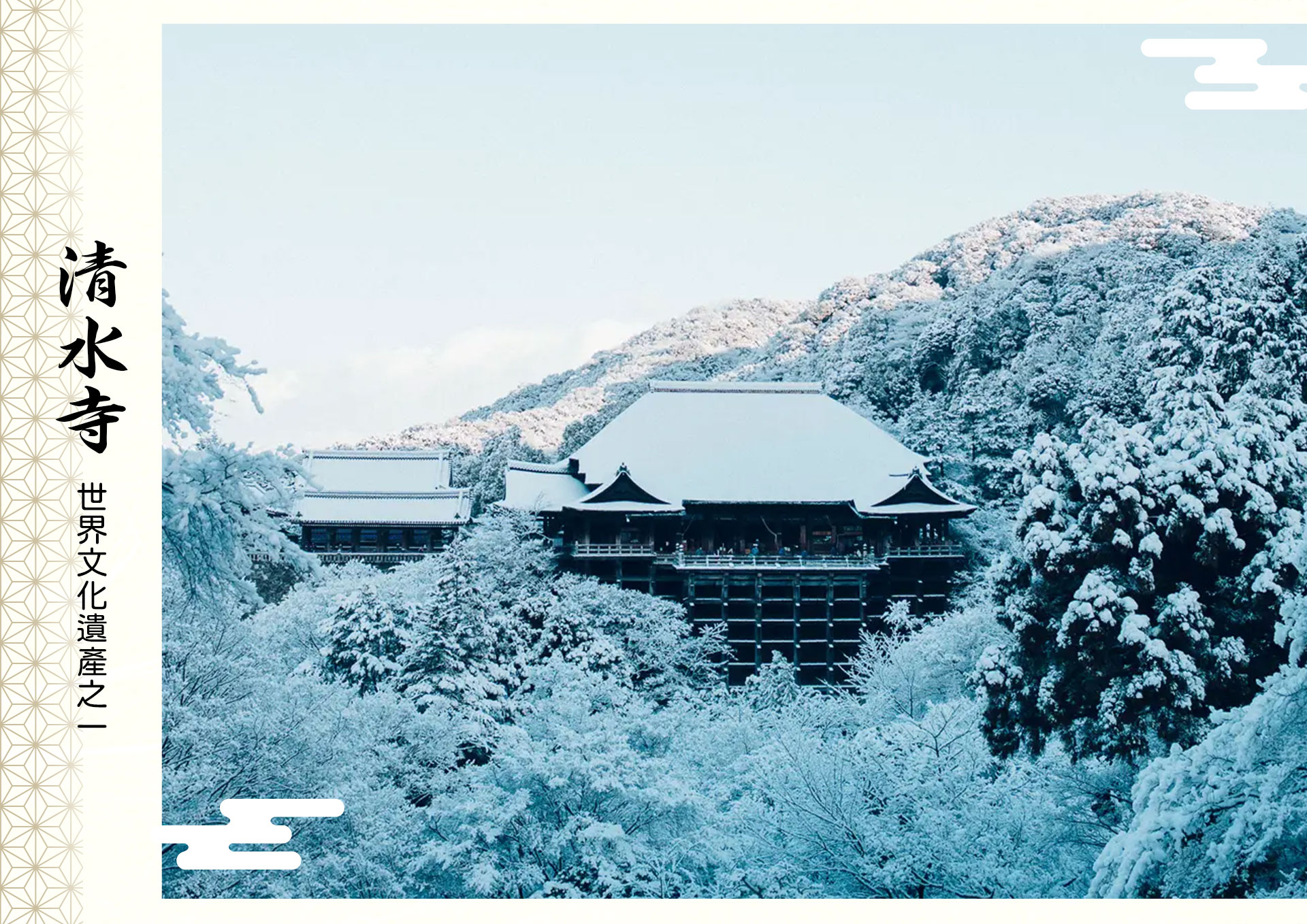 【清水寺】以清水舞台及求姻緣著名,所有建築物都要求與自然協調,為棟樑結構式寺院,各式風雅殿堂美輪美奐。寺院建築氣勢宏偉,結構巧妙,未用一根釘子。寺中六層炬木築成的木台為日本所罕見。其中由139根高數十公尺長的大圓木支撐、建築於峭壁上伸展而出的清水舞台更聞名於全日本,由此俯視京都全景更是絕美無比。站在院內眺望從樹林中升起的清水舞台、或站在清水舞台下方、或從茂密的枝葉中仰望斷崖上的清水舞台,各個角度都讓人嘆為觀止。據說舉凡從舞台及姻緣石走過一遭者,除可健康長壽外更可締結良緣。