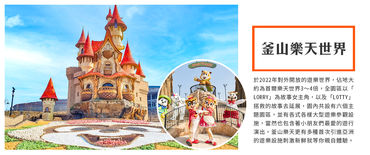 位於釜山地鐵東海線至「奧西利亞站」的「釜山樂天Adventure」總面積為15.8萬平方公尺,堪稱韓國最大主題樂園,園區以童話故事為主題,「LORRY」則為故事女主角,每處景點皆以搭救故事延伸,如同闖關遊戲,總共6大區域,分別為「Joyful Meadows」「Royal Garden」「Wonder Woods」「Rainbow Springs」「Tinker Falls」與「Underland」等,包含各式各樣娛樂項目以及17項刺激設施,還有演出及遊行。絕對讓大人小孩都玩到並軌!