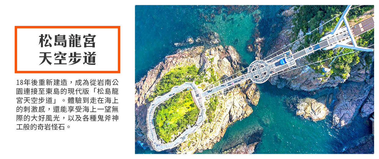 【松島龍宮雲橋】是可以縱覽松島全景的地方。岩南公園海岸散步路、天空中穿梭的纜車和松島海水浴場全景盡收眼底,非常漂亮。龍宮雲橋是一座鐵網橋,人們可以通過網洞看見腳下的奇岩怪石和碧綠海水。海浪拍打在石頭上,激起一層層雪白的浪花。海岸山岩上的垂釣者形成了一道獨特的風景線。行走在鐵網上,洶湧的海浪和奇特的岩石都仿佛觸手可及,這一切都讓人心情暢快。