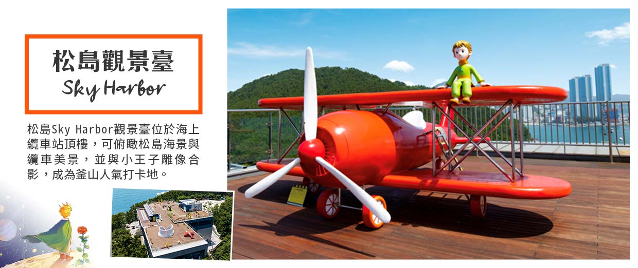 【松島Sky Harbor觀景臺】想要在釜山邂逅小王子,現在除了甘川文化村外,「松島Sky Harbor觀景臺」也可打卡拍美照,像是坐在飛機艙跟小王子與聖修伯里的飛機,以最佳角度欣賞松島大海和纜車組成的壯觀美景,或是到一旁踩著行李箱的小王子體驗旅行的樂趣,再往下走,可跟小王子坐在木梯遠眺海景!