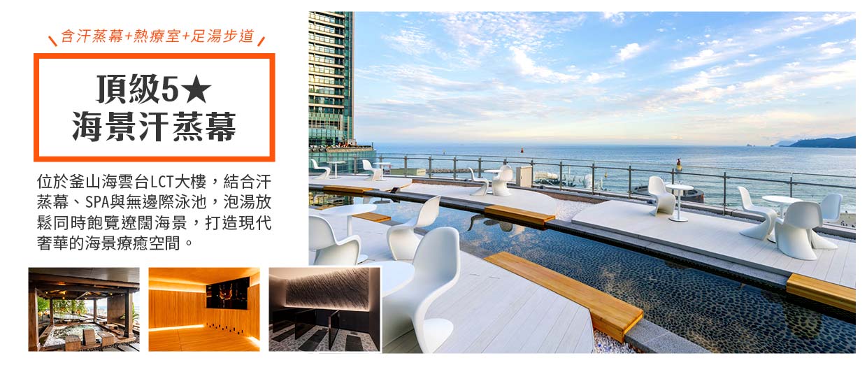 【海雲台最新景點~海景汗蒸幕CLUB D OASIS(含汗蒸幕+熱療室+足湯步道)】CLUBD OASIS位於以美麗海景而聞名的釜山旅遊渡假勝地-海雲臺,在這裡不僅可以享受戲水的樂趣,還能從各個角度欣賞海雲臺的海景。5樓的戶外SPA區更有知名咖啡廳「清水堂」;6樓則有露天足湯步道,可以坐著一邊泡腳,一邊欣賞海雲臺的蔚藍大海與天空。此外,也不要錯過的5種主題熱療室與汗蒸幕,流完一身汗可以排毒並讓人全身筋骨放鬆!