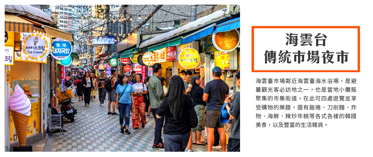【釜山海雲臺市場】海雲臺市場鄰近海雲臺海水浴場,是必訪地之一。在此可四處遊覽並享受購物的樂趣,不僅有各種新鮮便宜的蔬菜、肉類與魚貝類,還有飯捲、辣炒年糕等各式各樣的美食,以及豐富的生活雜貨,令人流連忘返。