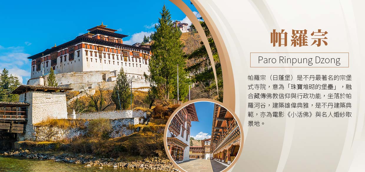帕羅宗─飛機越過群峰,抵達機場停機坪,遠遠就能望見帕羅宗雄偉的端坐在陡峭山壁中。它是帕羅政教中心,政府行政官員都在此上班。從參佛大殿的露臺往外望視野極佳盡覽帕羅河谷絕美景色。