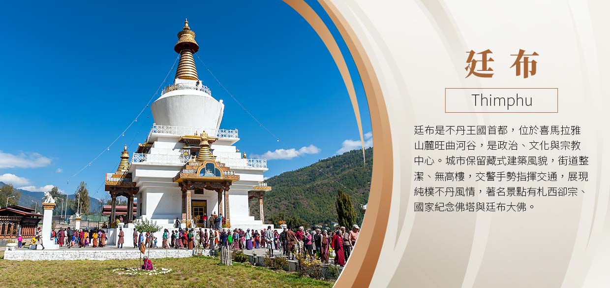 廷布─身為最後香格里拉不丹的首都,是全世界唯一沒有紅綠燈的國家首都,只靠著警察戴著白色手套的雙手指揮交通,路上三步一佛塔、五步一寺廟,以及來來往往穿著紅袍的喇嘛與僧侶,是一個傳統與現代並存的城市。