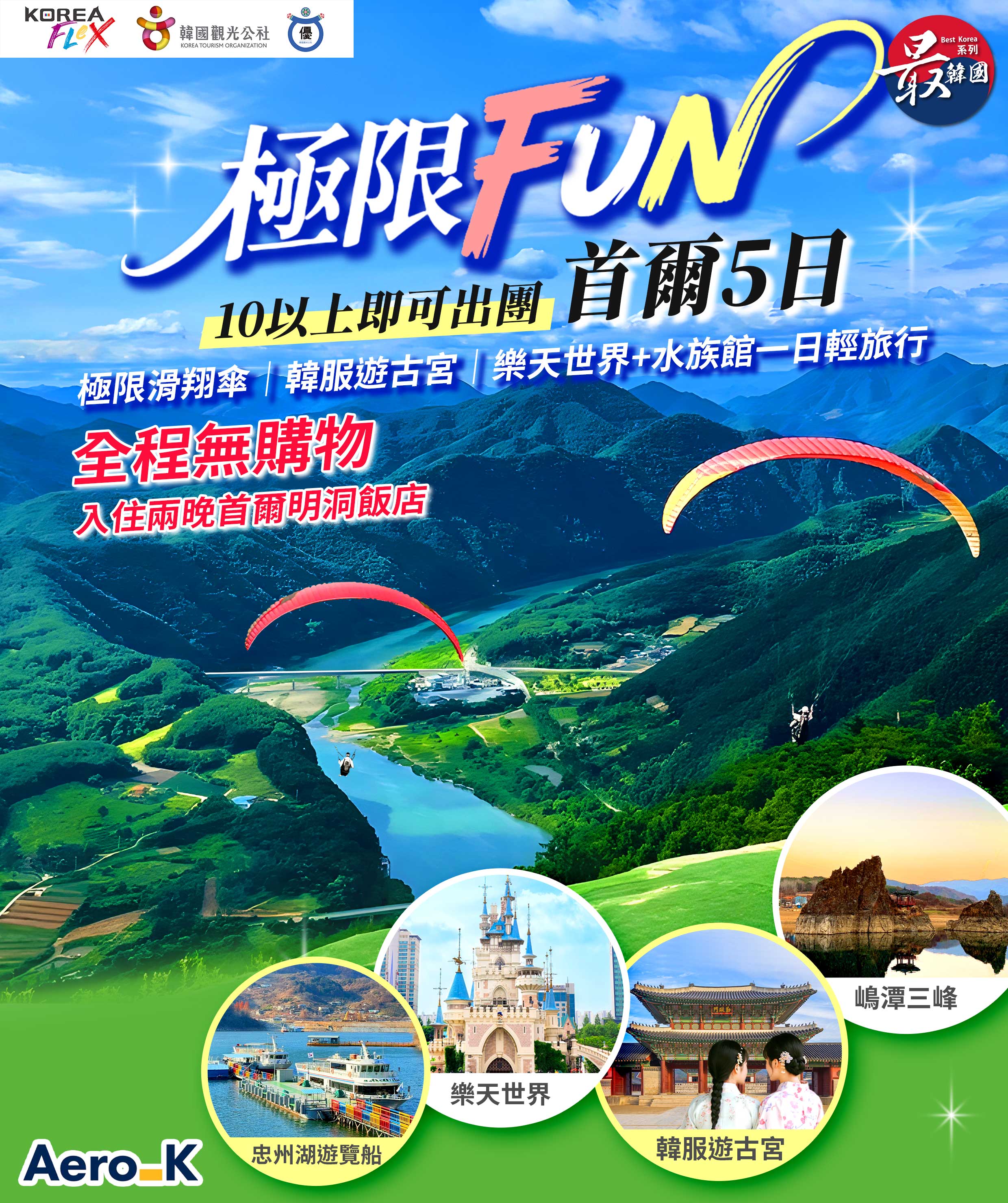 2026/03/08(日) | 桃園國際機場出發 可依~極限FUN首爾~極限滑翔傘+韓服遊古宮+樂天世界+水族館一日輕旅行五日(無購物10人以上可出團)機位 25 候補0 已售0 可售24無購物〡可依航空 |