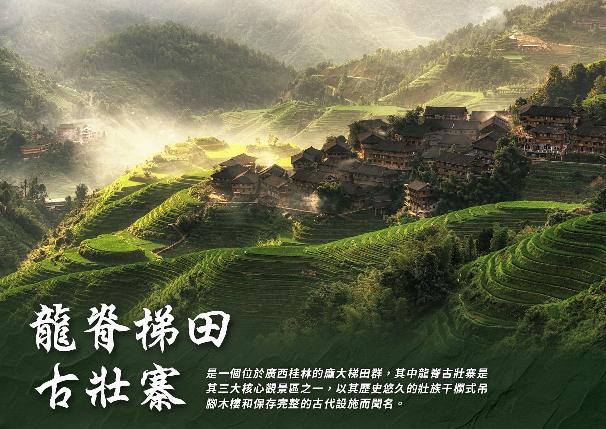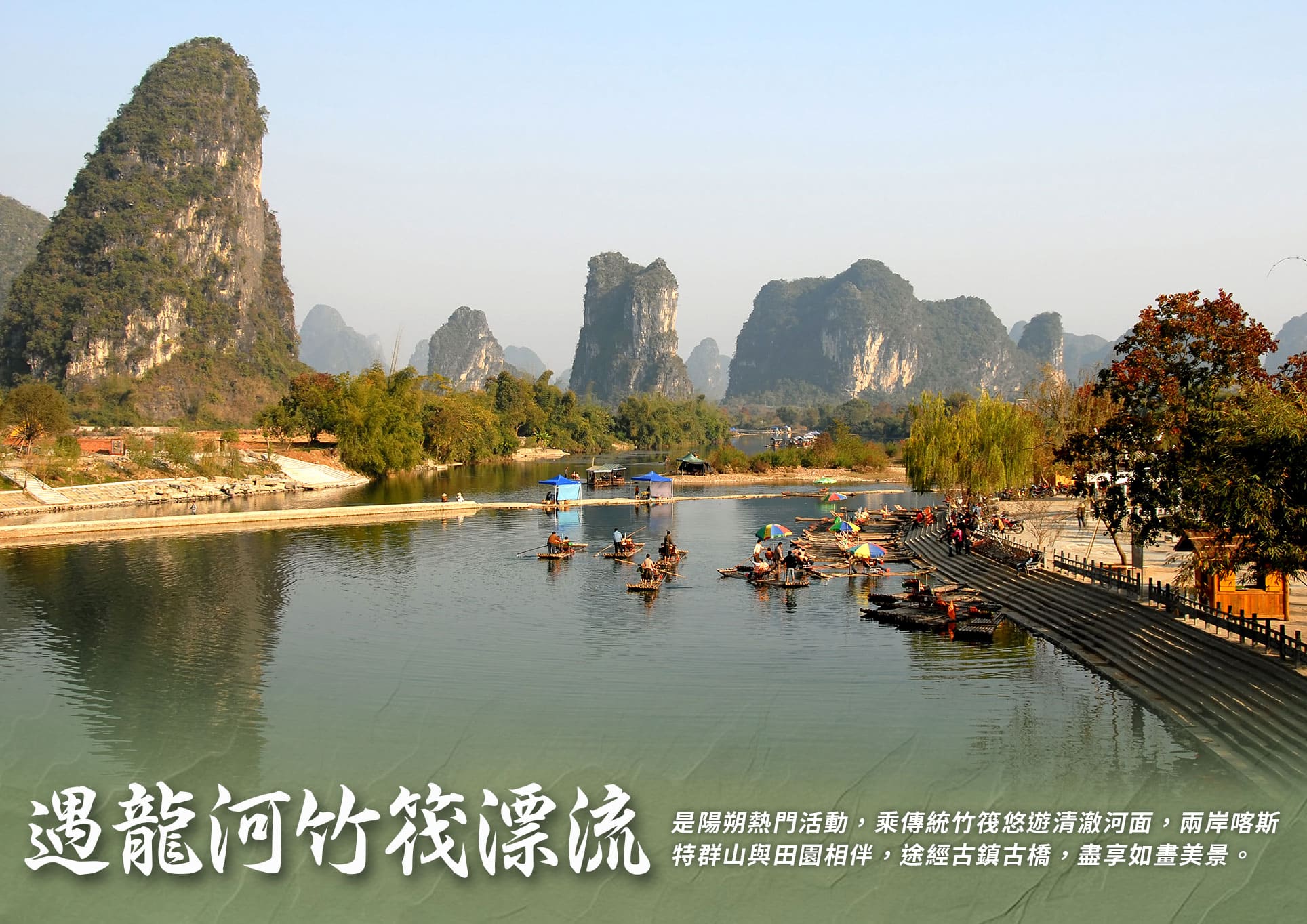 ✿【精選景點安排】:龍脊梯田+古壯寨、三江鼓樓、程陽八寨+風雨橋、象鼻山、七星景區(桂海碑林+駱駝峰)、興坪古鎮、船遊灕江(興坪碼頭上下) 、陽朔遇龍河竹筏漂流(8人一筏)、銀子岩、螺獅粉文化展覽館。